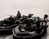 DescriptionTwo large rubber rafts floating along the shoreline are filled with camping equipment, fishing gear and three women passengers. An elderly woman (Georgia O'Keeffe) sits in the raft on the left stringing a fishing rod. A woman (Tish Frank) lounges in the back of the right raft while another woman is perched at the front. A woman in a sun hat stands in the water next to the raft at the right.On View