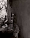 DescriptionPelvis bone rests on floor of portal with cow skull hanging on adobe wall above. Black wrought iron fence at end with another bone hanging on it, shrubs beyond.On View