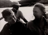 DescriptionClose-up of an elderly woman (O'Keeffe) and a young boy (Girard) sitting side by side in a boat. The boy is looking over his right shoulder at the woman who is looking at him. Both are slyly grinning at one another. A man in a ball cap sits behind them rowing the boat. In the background is the lake and mountains.On View