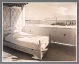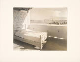 DescriptionWooden bed with mattress against wall, view of building and landscape in background.On View
