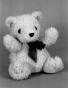 DescriptionStuffed Teddy Bear with black eyes and nose, ribbon tied into avow under chin.