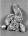 DescriptionStuffed, brown, fuzzy teddy bear resting on its head, black eyes and a brown nose.
