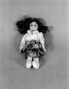 DescriptionDoll with curly hair wearing a solid top and patterned skirt, no shoes.On View