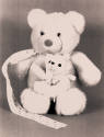 DescriptionMother and child, white stuffed teddy bears, ribbon with hearts around bears' throat, big bear has black eyes and a pink nose, small bear has black eyes and nose.On View