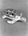 DescriptionCeramic turtle with two finger holes, turtle has small black eyes and a smiling open mouth.On View