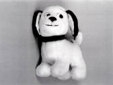 DescriptionWhite stuffed toy dog with long black ears, black eyes, nose and mouth, dark collar.On View
