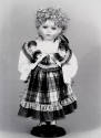 DescriptionDoll with yellow curly hair, white shirt and a patterned dress, bow in center of chest.On View
