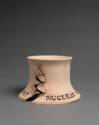 DescriptionClay sculpture resembles a cup holder, no bottom and wide base,zig-zag break from base to below rim.On View