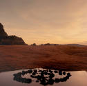 DescriptionDesert landscape with mountains and a yellow sunrise with water in foreground with circular rock formation protruding from water.On View
