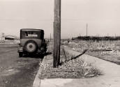 DescriptionRear view of a Model-T car parked in flat rural area. Telephone pole in center, sidewalk at bottom and right unkempt ground, only building is a hanger-type structure in far left.On View