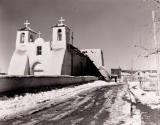DescriptionFacade of the church is to the left side of the image. A dirt road with snow and ice runs diagonally from left to right in the center. Buildings are in the background.On View