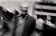 DescriptionBlack and white city scape with a male figure facing the camera in the foreground and another figure whose back is at the camera in the background. Image is out of focus giving the illusion of movement and confusion.eMuseum Notes