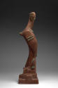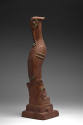DescriptionDark brown sculpture of a tall crane-like bird. The head of the crane is facing the back and the beak is tucked into the neck. The wings, back, eyes, front of the chest, near the legs and feet are all decorated with small circular areas in green glaze. There is a six-petaled flower on the front (?) of the base with a hole in the center.On View