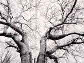 DescriptionUpward view of a deciduous tree without leaves, its trunk divided and growing in half to accommodate power line and utility pole in the middle. Composition is filled with its trunk and branches. Bare branches of another tree in left background.eMuseum Notes