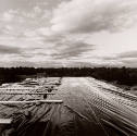 DescriptionView from the top of a flat roof under construction. Wooden beams and bricks/rocks are laid out systematically on the left side of the roof. The rooftop is covered in plastic. Trees surround the building, and the sky above is filled with clouds.On View