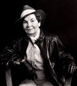 DescriptionBlack and white photo of a lady sitting sideways on a chair facing the camera. She is weard a dark fedoria hat with a wide light colored ribbon ban. She is also wearing a dark jacket, dark gloves and dark pants with a light colored shirt. The background is very dark.On View