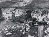 DescriptionA man wearing glasses and a bandana, and holding a square object stands behind a mounted camera tripod at the right of the image. To the left stands an elderly woman in a long skirt holding a sketchbook and pen. Both are situated in a cave like room with a rocky stream bed between them. Framing the pair in the background is a rock wall.On View