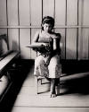 DescriptionAdolescent female sits alone in a seemingly empty schoolhouse. She wears a scowl on her face, staring back at the camera with her head slightly lowered, eyes looking upward at the photographer. She sits at a wooden desk in a crochet tank top, patterned skirt, headband, and bear feet. An empty wood bench is at the left side of the frame.On View