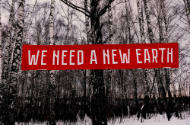 DescriptionOne of three photographs of a wooded landscape with a red banner that reads: "WE NEED A NEW EARTH."On View