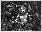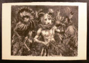 DescriptionFive figures in varying masks. At left figure wears large feather headdress. At back right a figure wears a mask with a bird beak and a few feathers.On View