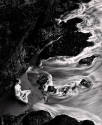 DescriptionYoung woman sits naked in "Lotus" position on sand below cliffs. Tide swirls in and out around rocks.On View