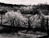 DescriptionLandscape with fields bordered by flowering fruit trees. Line of rock formations on horizon with faint mountains and clouds beyond.On View