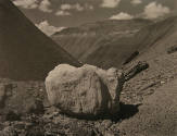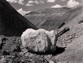 DescriptionLarge white boulder center foreground with slopes of black rockformations in background; small white clouds.On View