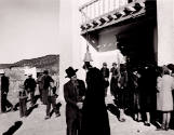 DescriptionCongregation leaving the church after mass. Man in overalls,center, shakes hands with black-cloaked figure; men, women and children gather in groups to talk in front of church, hills left background.On View