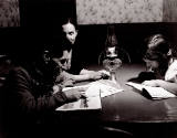 DescriptionMan seated at table lit by oil lamp, looks at a book opened to pictures, woman seated behind him looks on, girl across table doing homework.On View