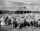 DescriptionFlock of sheep standing in front of building, man is pointing, little girl stands next to him, background farm out-building, wagon and horno. Mountains and weather vane at upper right.On View