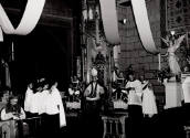 DescriptionCatholic Church archbishop sitting on throne in Saint Francis Cathedral with alters boys watching. Two priests seating on either side of archbishop. Archway at left background, corner of altar at right edge. Wide streamers swaged from ceiling to walls.On View
